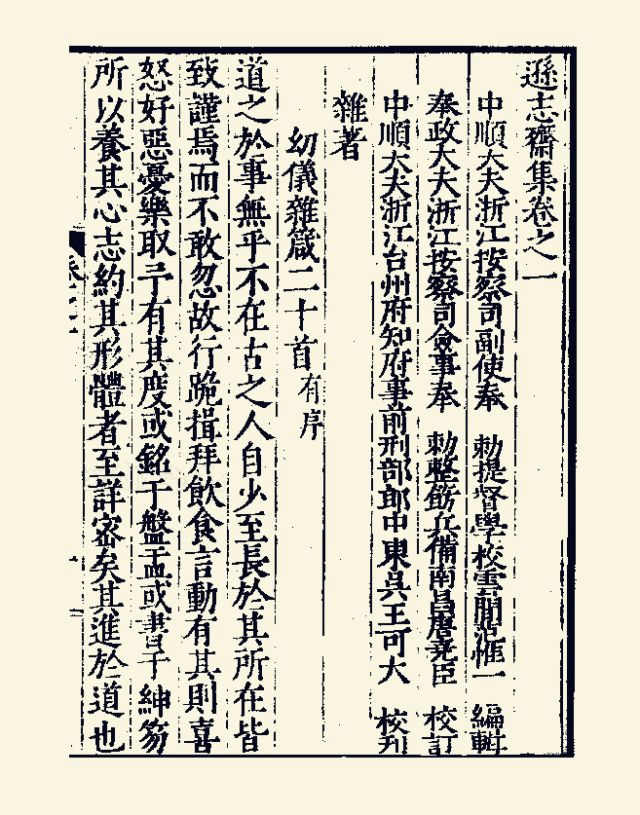 《逊志斋集》二十四卷,明方孝孺撰。方孝孺(1357—1402),字希直,一字希古,号逊志,浙江宁海人。洪武中以荐召授汉中府学教授;建文中召为翰林侍讲,官至翰林侍讲学士。燕王兵入京师,令其草即位诏书,不从被杀,并夷十族。其修身为学深受程朱熏染,以六经为根底,以孔孟为依归,以明王道、致太平、辟异端为己任,反对空谈,勇于践履。《逊志斋集》主要内容就在如何修养心性,成为“明王道”的道德君子。认为学道之初要“养其心志,约其形体”,这可以在日常生活的一言一行、一举一动中加以修炼。因此《幼仪杂箴》篇列举了坐、立、行、寝、揖、拜、食、饮、言、动、笑、喜、怒、忧、好、恶、取、与、诵、书二十项与人日常生活密切相关的“当勉之目”为箴,“揭于左右”,其目的是“近而至乎远”,使修道者由“克己”达到“忘己”,使“其心虚明广大,与天地同体”,从而“参配天地”,几达“圣人之象”。